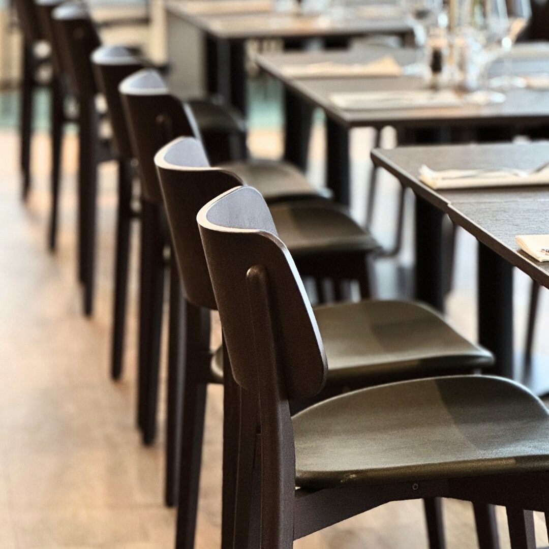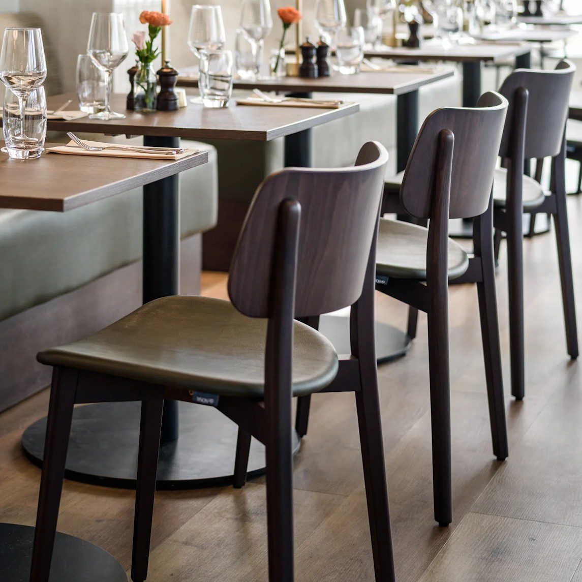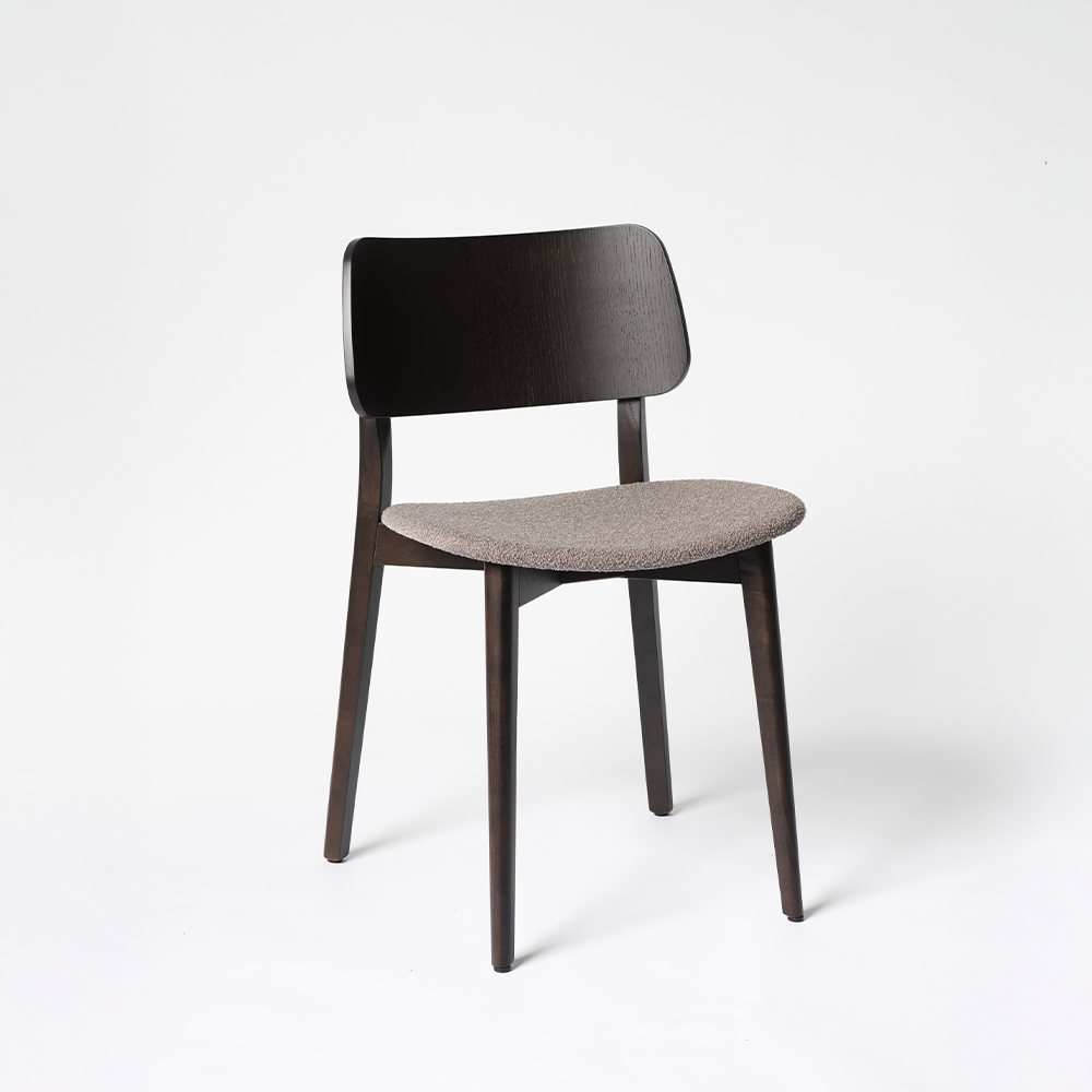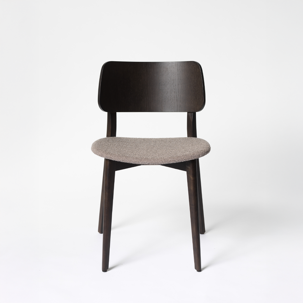 Stol i ek eller bok med stoppad sits. Kan fås stapelbar mot förfrågan. Med mindre sits och staplingsskydd kan den staplas upp till 6st på mark.
